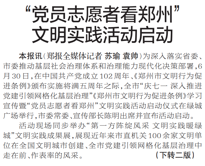 为深入落实省委、市委推动基层社会治理体系和治理能力现代化决策部署,6月30日,在中国共产党成立102周年、《郑州市文明行为促进条例》颁布实施将满五周年之际,全市“庆七一 深入推进党建引领网格化基层治理”《郑州市文明行为促进条例》学习宣传暨“党员志愿者看郑州”文明实践活动启动仪式在绿城广场举行,市委常委、宣传部长陈明出席并宣布活动启动。(今日《郑州日报》1版、2版)