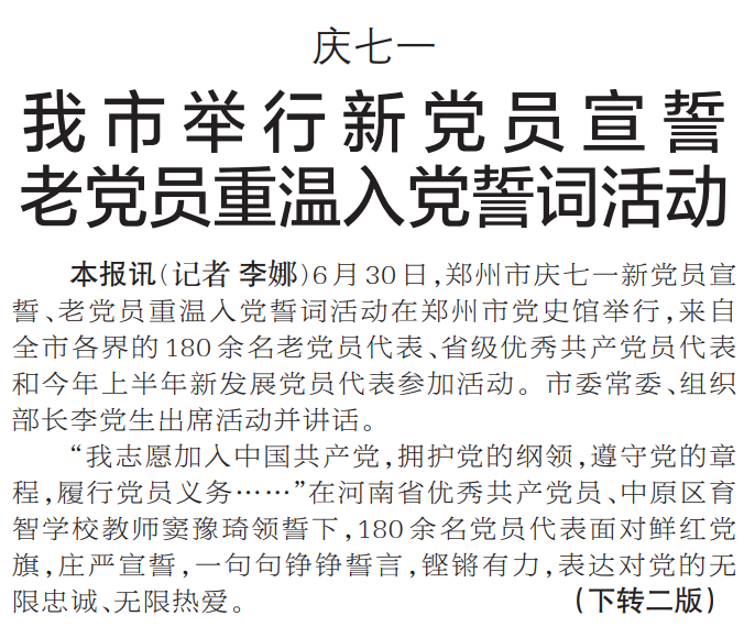 6月30日,郑州市庆七一新党员宣誓、老党员重温入党誓词活动在郑州市党史馆举行,来自全市各界的180余名老党员代表、省级优秀共产党员代表和今年上半年新发展党员代表参加活动。市委常委、组织部长李党生出席活动并讲话。(今日《郑州日报》1版、2版)
