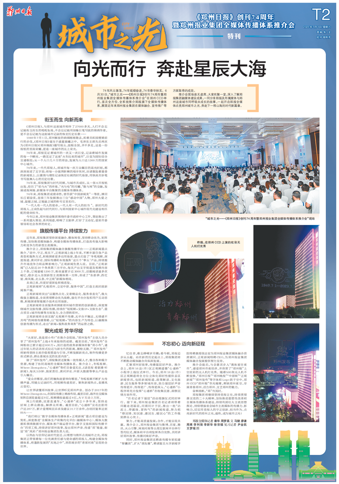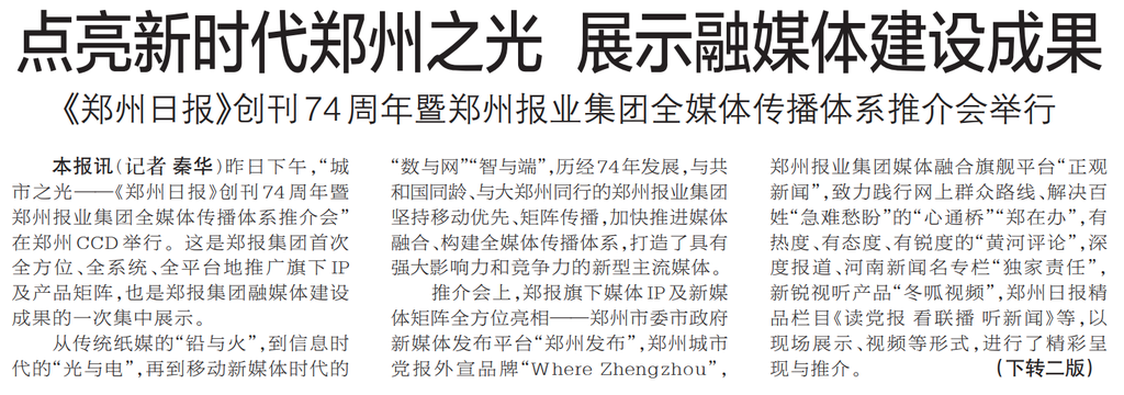 昨日下午,“城市之光——《郑州日报》创刊74周年暨郑州报业集团全媒体传播体系推介会”在郑州CCD举行。这是郑报集团首次全方位、全系统、全平台地推广旗下IP及产品矩阵,也是郑报集团融媒体建设成果的一次集中展示。(今日《郑州日报》1版、2版)