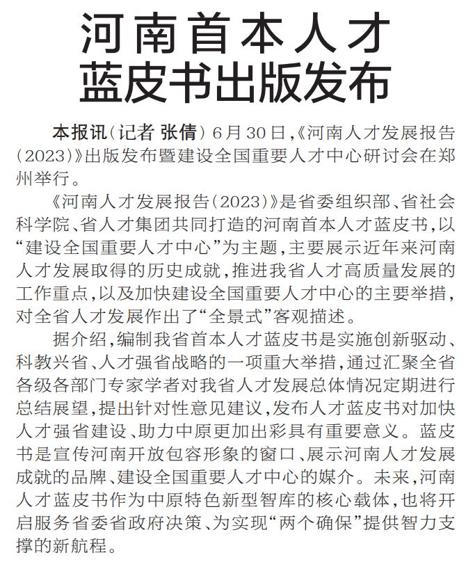 6月30日,《河南人才发展报告(2023)》出版发布暨建设全国重要人才中心研讨会在郑州举行。(今日《郑州日报》1版)