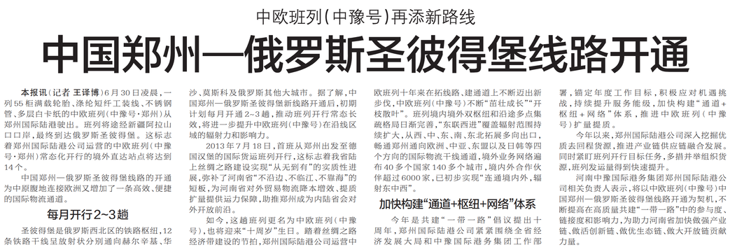中国郑州—俄罗斯圣彼得堡线路开通