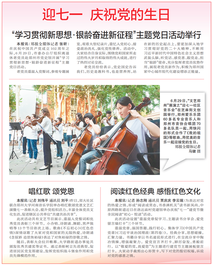 昨日,郑大社区联合郑州大学河南音乐学院举办唱红歌颂党恩文艺汇演暨七一表彰大会,提升党组织活力,丰富全体党员文化生活,促进辖区公共单位“共建共治共享”。(今日《郑州日报》2版)