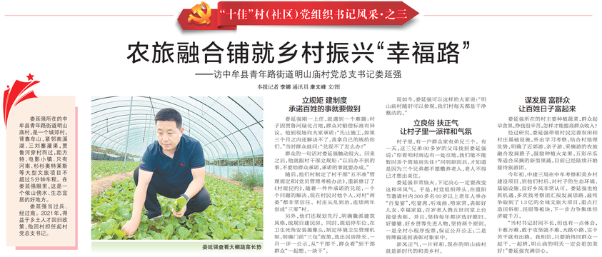 娄延强所在的中牟县青年路街道明山庙村,是一个城郊村,背靠牟山,紧邻南溪湖、三刘寨灌渠,贾鲁河穿村而过,距方特、电影小镇、只有河南、杉杉奥特莱斯等大型文旅项目不超过5分钟车程。在娄延强眼里,这是一个依山傍水、生态宜居的好地方。(今日《郑州日报》2版)