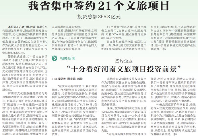 在构建新发展格局、推动高质量发展大背景下,文化旅游成为投资和消费的热点。6月30日,2023河南省文旅文创发展大会签约仪式在洛阳举行。作为此次大会重要配套活动之一,本次签约共梳理41个重点文旅项目,投资总额525.6亿元。(今日《河南日报》2版)