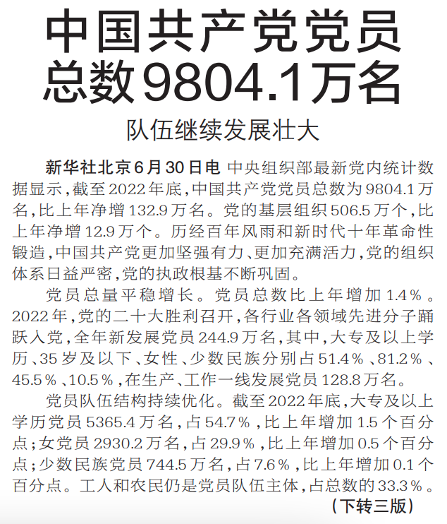 中央组织部最新党内统计数据显示,截至2022年底,中国共产党党员总数为9804.1万名,比上年净增132.9万名。党的基层组织506.5万个,比上年净增12.9万个。历经百年风雨和新时代十年革命性锻造,中国共产党更加坚强有力、更加充满活力,党的组织体系日益严密,党的执政根基不断巩固。(今日《郑州日报》1版、3版)