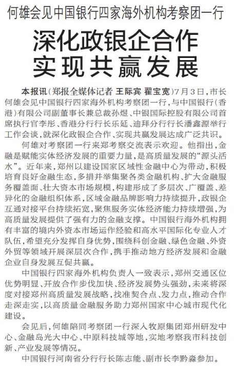 7月3日,市长何雄会见中国银行四家海外机构考察团一行,与中国银行(香港)有限公司副董事长兼总裁孙煜、中银国际控股有限公司首席执行官李彤、香港分行行长乐延、迪拜分行行长潘鑫源举行工作会谈,就深化政银企合作、实现共赢发展达成广泛共识。(今日《郑州日报》1版)