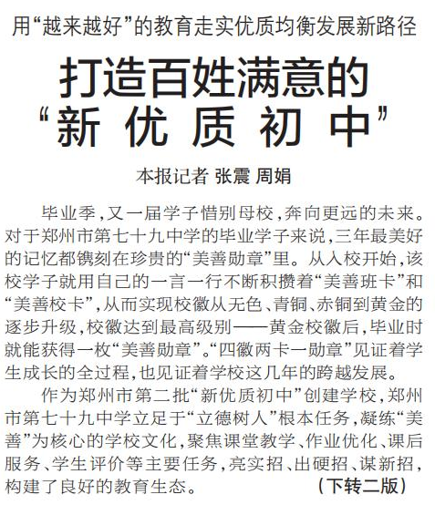 毕业季,又一届学子惜别母校,奔向更远的未来。对于郑州市第七十九中学的毕业学子来说,三年最美好的记忆都镌刻在珍贵的“美善勋章”里。从入校开始,该校学子就用自己的一言一行不断积攒着“美善班卡”和“美善校卡”,从而实现校徽从无色、青铜、赤铜到黄金的逐步升级,校徽达到最高级别——黄金校徽后,毕业时就能获得一枚“美善勋章”。“四徽两卡一勋章”见证着学生成长的全过程,也见证着学校这几年的跨越发展。(今日《郑州日报》1版、2版)