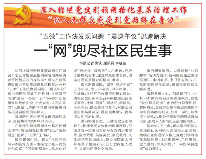 如何让基层网格化覆盖到每户居民?怎么才能在最短时间发现并解决老百姓最关心的身边事?巩义市新华路街道办事处货场路社区探索出一种“五微”工作法发现问题 ,“晨巡午议”解决问题的高效工作机制,打通基层治理“最后一公里”,让“小网格”汇聚起保障政治安全、社会安定、人民安乐的“大能量”,不断将党建引领推进网格化基层治理引向深入。(今日《郑州日报》1版)