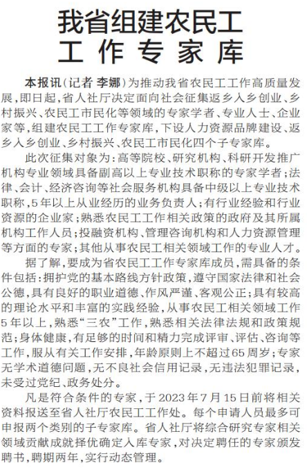 为推动我省农民工工作高质量发展,即日起,省人社厅决定面向社会征集返乡入乡创业、乡村振兴、农民工市民化等领域的专家学者、专业人士、企业家等,组建农民工工作专家库,下设人力资源品牌建设、返乡入乡创业、乡村振兴、农民工市民化四个子专家库。(今日《郑州日报》2版)