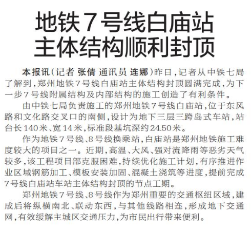 昨日,记者从中铁七局了解到,郑州地铁7号线白庙站主体结构封顶圆满完成,为下一步7号线附属结构及内部结构的施工创造了有利条件。(今日《郑州日报》5版)