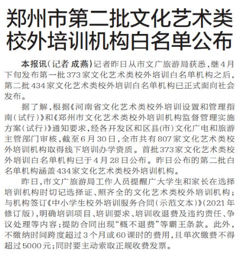 郑州市第二批文化艺术类校外培训机构白名单公布