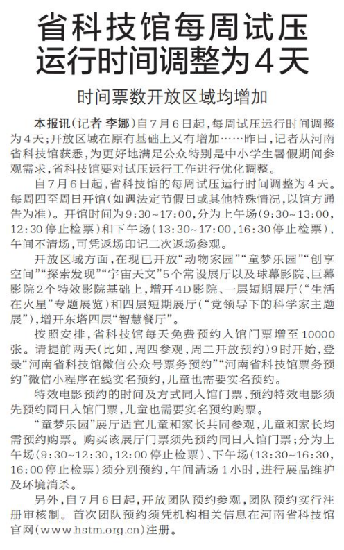 自7月6日起,每周试压运行时间调整为4天;开放区域在原有基础上又有增加……昨日,记者从河南省科技馆获悉,为更好地满足公众特别是中小学生暑假期间参观需求,省科技馆要对试压运行工作进行优化调整。(今日《郑州日报》5版)