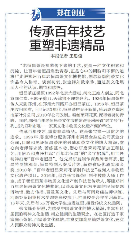 “老恒昌茶是祖辈传下来的手艺,更是一种文化积累和沉淀。让百年老恒昌焕发青春,正是心中的期盼和不懈的追求!”走进郑州百年老恒昌茶文化博物馆,创意新颖的茶文化饰品令人称奇。谈到初衷,张宝锋如数家珍,通过茶文化展示人生的认识、期待和感悟。(今日《郑州日报》6版)