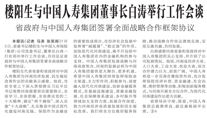 7月3日,省委书记楼阳生与中国人寿保险(集团)公司党委书记、董事长白涛一行在郑州举行工作会谈,共同见证省政府与中国人寿集团签署全面战略合作框架协议。(今日《河南日报》1版)