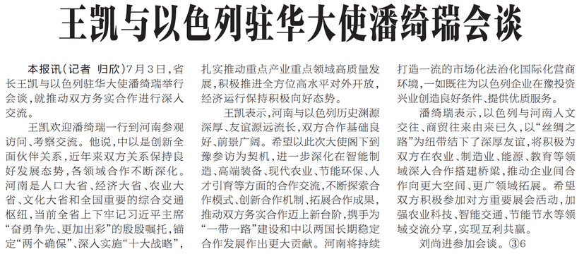 7月3日,省长王凯与以色列驻华大使潘绮瑞举行会谈,就推动双方务实合作进行深入交流。(今日《河南日报》1版)
