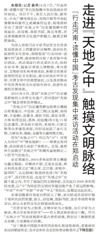 8月7日,“行走河南·读懂中国”考古发现集中采访活动在郑州启动。当日下午,来自人民日报、新华社、中央广播电视总台、光明日报等中央驻豫媒体和省市主流媒体的记者,现场调研采访了登封“天地之中”历史建筑群中的观星台、启母阙、嵩阳书院、嵩岳寺塔,在这里领略世界文化遗产的魅力,触摸文明的脉络。(今日《郑州日报》1版、5版)