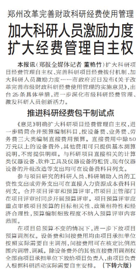 郑州改革完善财政科研经费使用管理
