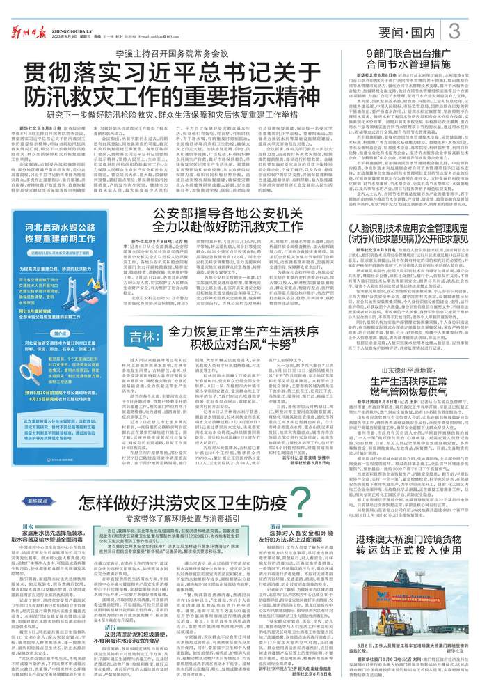 国务院总理李强8月8日主持召开国务院常务会议,贯彻落实习近平总书记关于防汛救灾工作的重要指示精神,听取当前防汛抗洪救灾情况汇报,研究下一步做好防汛抢险救灾、群众生活保障和灾后恢复重建工作举措。(今日《人民日报》1版)