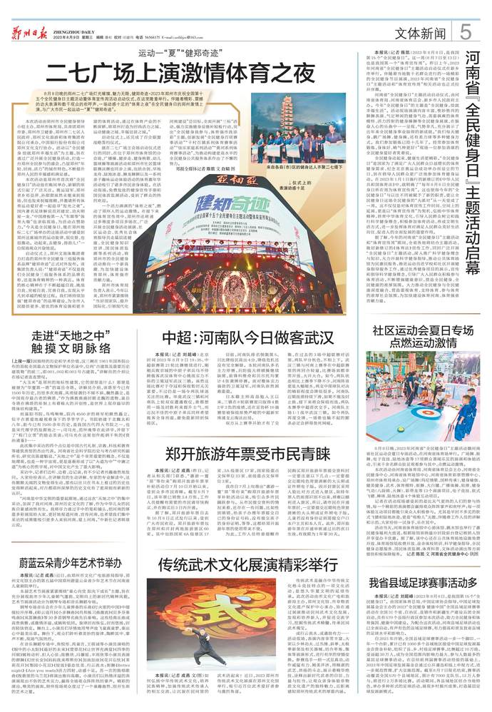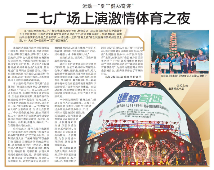 8月8日晚的郑州二七广场灯光璀璨、魅力无限,健郑奇迹·2023年郑州市庆祝全国第十五个全民健身日主题活动暨体育宣传周活动启动仪式,在这里隆重举行。伴随着精彩、震撼的功夫表演和数千观众的欢呼声,一场动感十足的“体育之夜”在全民健身日的郑州激情上演,与广大市民一起运动一“夏”“健郑奇迹”。(今日《郑州日报》5版)