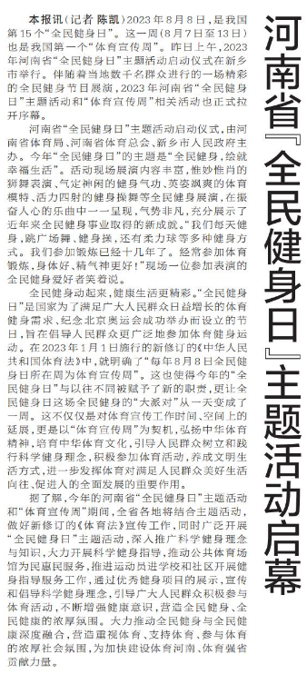 2023年8月8日,是我国第15个“全民健身日”。这一周(8月7日至13日)也是我国第一个“体育宣传周”。昨日上午,2023年河南省“全民健身日”主题活动启动仪式在新乡市举行。伴随着当地数千名群众进行的一场精彩的全民健身节目展演,2023年河南省“全民健身日”主题活动和“体育宣传周”相关活动也正式拉开序幕。(今日《郑州日报》5版)
