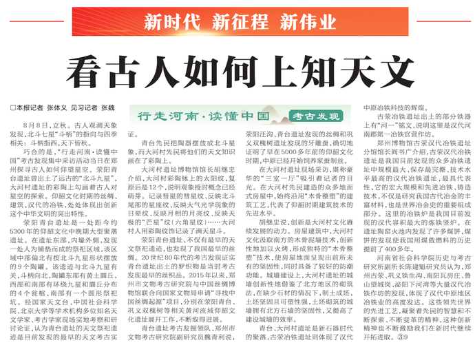 巧合的是,“行走河南·读懂中国”考古发现集中采访活动当日在郑州探寻古人如何仰望星空。荥阳青台遗址曾出土了远古的“北斗九星”,大河村遗址的彩陶上勾画着古人对星空的探索。仰韶文化时期的丝绸、建筑,汉代的冶铁,处处体现出创新这个中华文明的突出特性。(今日《河南日报》2版)