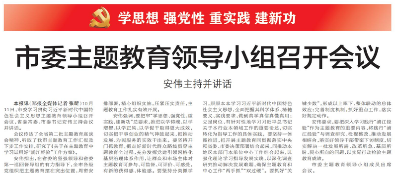 10月11日,市委学习贯彻习近平新时代中国特色社会主义思想主题教育领导小组召开会议,省委常委、市委书记安伟主持会议并讲话。