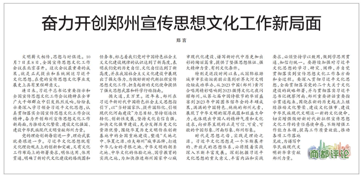 文明薪火相传,思想与时俱进。10月7日至8日,全国宣传思想文化工作会议在北京召开。这次会议最重要的成果,就是正式提出和系统阐述习近平文化思想,在党的宣传思想文化事业发展史上具有里程碑意义。(今日《郑州日报》1版)