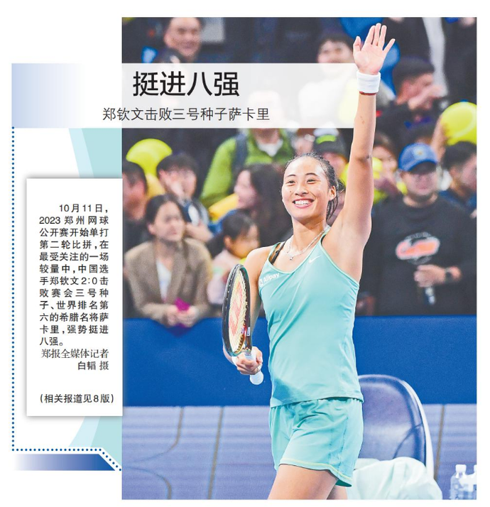 10月11日,2023郑州网球公开赛开始单打第二轮比拼,在最受关注的一场较量中,中国选手郑钦文2∶0击败赛会三号种子、世界排名第六的希腊名将萨卡里,强势挺进八强。(今日《郑州日报》1版、8版)