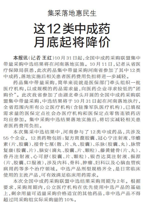 10月31日起,全国中成药采购联盟集中带量采购中选结果将在河南落地实施。10月11日,记者从省医疗保障局获悉,此次药品集中带量采购河南省参加了其中12类中成药,落地实施后相关患者医药费用负担将进一步减轻。(今日《郑州日报》1版)