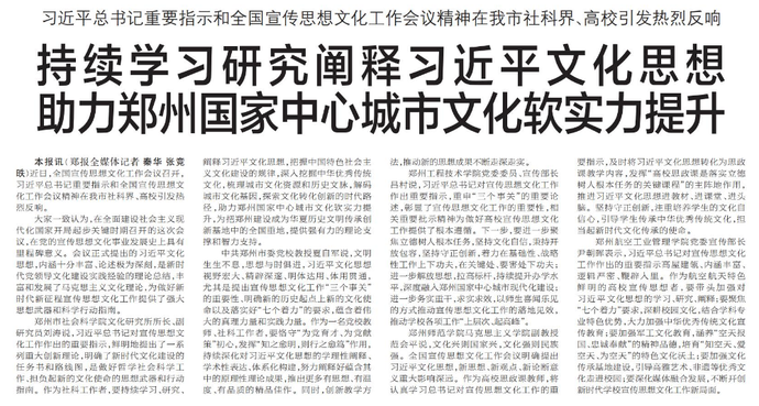 近日,全国宣传思想文化工作会议召开,习近平总书记重要指示和全国宣传思想文化工作会议精神在我市社科界、高校引发热烈反响。(今日《郑州日报》2版)