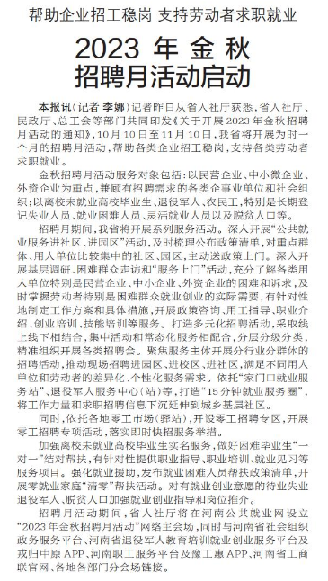 记者昨日从省人社厅获悉,省人社厅、民政厅、总工会等部门共同印发《关于开展2023年金秋招聘月活动的通知》,10月10日至11月10日,我省将开展为时一个月的招聘月活动,帮助各类企业招工稳岗,支持各类劳动者求职就业。(今日《郑州日报》2版)