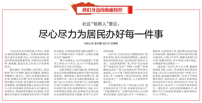 “社区是社会治理的最小单元,是落实党的政策的落脚点。”对城东路街道商城东里社区党委书记、主任楚征来说,居民的事就是最重要的事,为居民办实事好事、解难题,就是社区工作者义不容辞的责任。(今日《郑州日报》2版)