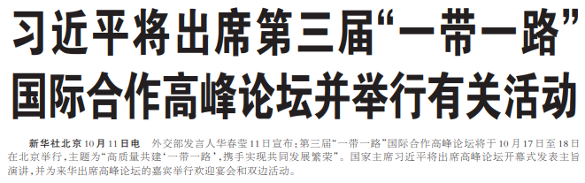外交部发言人华春莹11日宣布:第三届“一带一路”国际合作高峰论坛将于10月17日至18日在北京举行,主题为“高质量共建‘一带一路’,携手实现共同发展繁荣”。国家主席习近平将出席高峰论坛开幕式发表主旨演讲,并为来华出席高峰论坛的嘉宾举行欢迎宴会和双边活动。(今日《人民日报》1版)