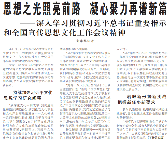 大家一致表示,习近平文化思想在党的宣传思想文化事业发展史上具有里程碑意义,要深入学习贯彻习近平文化思想,把各项要求部署不折不扣落细落实,书写新时代宣传思想文化事业新篇章。(今日《人民日报》1版、4版)
