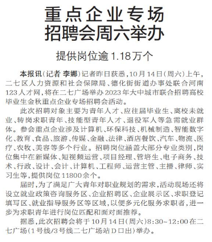 记者昨日获悉,10月14日(周六)上午,二七区人力资源和社会保障局、德化街街道办事处联合河南123人才网,将在二七广场举办2023年大中城市联合招聘高校毕业生金秋重点企业专场招聘会活动。(今日《郑州日报》2版)