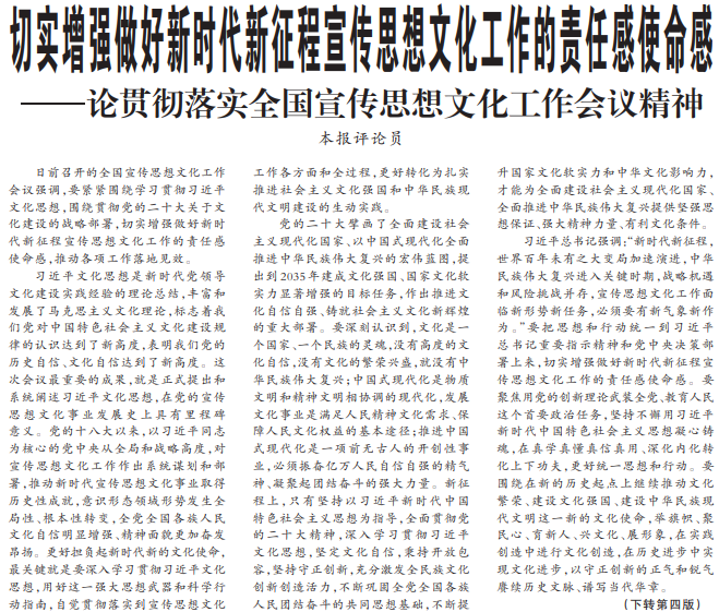 日前召开的全国宣传思想文化工作会议强调,要紧紧围绕学习贯彻习近平文化思想,围绕贯彻党的二十大关于文化建设的战略部署,切实增强做好新时代新征程宣传思想文化工作的责任感使命感,推动各项工作落地见效。(今日《人民日报》1版、4版)