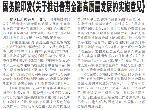 国务院日前印发《关于推进普惠金融高质量发展的实施意见》,明确了未来五年推进普惠金融高质量发展的指导思