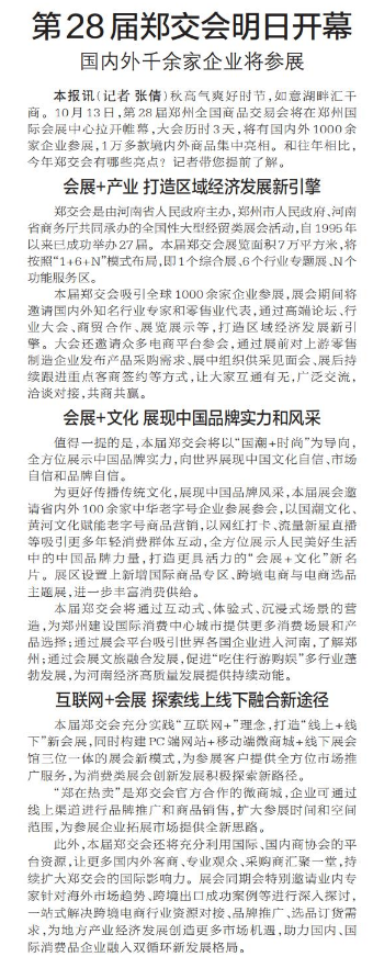 秋高气爽好时节,如意湖畔汇千商。10月13日,第28届郑州全国商品交易会将在郑州国际会展中心拉开帷幕,大会历时3天,将有国内外1000余家企业参展,1万多款境内外商品集中亮相。和往年相比,今年郑交会有哪些亮点?记者带您提前了解。(今日《郑州日报》6版)