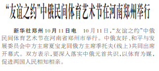 10月11日,“友谊之约”中俄民间体育艺术节在河南省郑州市举行。中俄友好、和平与发展委员会中方主席夏宝龙同俄方主席季托夫(线上)共同出席开幕式。双方表示,要深入落实中俄元首共识,以体育为媒,促进两国人民相知相亲。(今日《人民日报》3版)