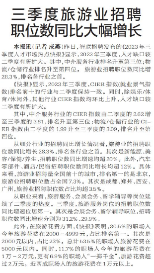 昨日,智联招聘发布的《2023年三季度人才市场热点快报》显示,2023年三季度,人才缺口较二季度有所扩大。其中,中介服务行业排名升至第三位;物流/仓储行业排名升至第四位。 旅游业招聘职位数同比增28.3%,排名各行业之首。(今日《郑州日报》6版)