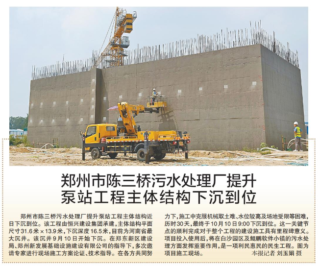 郑州市陈三桥污水处理厂提升泵站工程主体结构近日下沉到位。该工程由恒兴建设集团承建,主体结构平面尺寸31.6米×13.9米,下沉深度16.5米,目前为河南省最大沉井。该沉井9月10日开始下沉。在郑东新区建设局、郑州新发展基础设施建设有限公司的指导下,多次邀请专家进行现场施工方案论证、技术指导。在各方共同努力下,施工中克服机械取土难、水位较高及场地受限等困难,历时30天,最终于10月10日9:00下沉到位。这一关键节点的顺利完成对于整个工程的建设施工具有里程碑意义。项目投入使用后,将在白沙园区及鲲鹏软件小镇的污水处理方面发挥重要作用,是一项利民惠民的民生工程。(今日《郑州日报》6版)