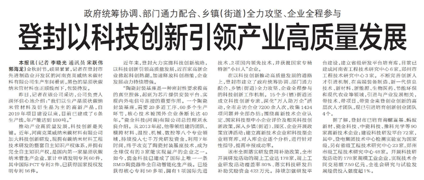 金秋时节,硕果累累,记者在登封市先进制造业开发区的河南克莱威纳米碳材料有限公司生产车间看到,黑色的晶须状碳纳米管材料也正顺线而下,包装待发。(今日《郑州日报》7版)