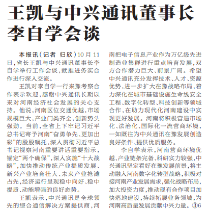 10月11日,省长王凯与中兴通讯董事长李自学举行工作会谈,就推进务实合作进行深入交流。(今日《河南日报》1版)