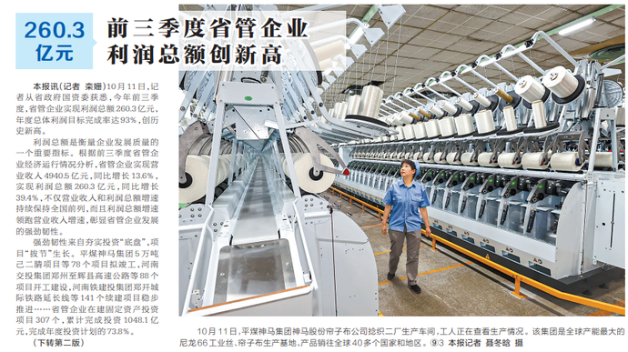 10月11日,记者从省政府国资委获悉,今年前三季度,省管企业实现利润总额260.3亿元,年度总体利润目标完成率达93%,创历史新高。(今日《河南日报》1版、2版)