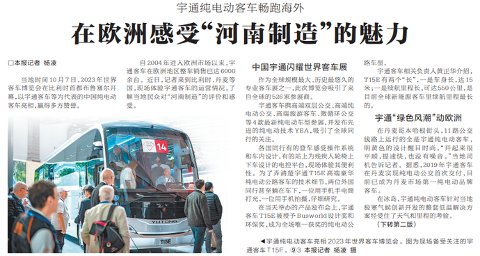 当地时间10月7日,2023年世界客车博览会在比利时首都布鲁塞尔开幕,以宇通客车等为代表的中国纯电动客车亮相,赢得多方赞誉。(今日《河南日报》1版、2版)