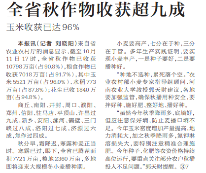 来自省农业农村厅的消息显示,截至10月11日17时,全省秋作物已收获10798万亩(占90.8%),粮食作物已收获7018万亩(占91.7%),其中玉米5521万亩(占96.0%)、水稻773万亩(占87.8%);花生已收1840万亩(占94.8%)。(今日《河南日报》1版)