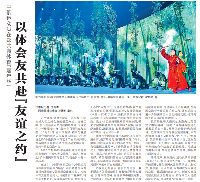 这个金秋,体育无疑是不同国家、不同地域人们之间会友的最潮方式。钱塘江畔,杭州亚运会点燃竞技赛场激情;天地之中,一场民间体育“嘉年华”同样如火如荼。10月11日,由中俄友好、和平与发展委员会和河南省人民政府共同举办的“友谊之约”中俄民间体育艺术节在郑州开幕,为两国青少年和运动员搭建起文明互鉴、美美与共的交流平台。(今日《河南日报》2版)