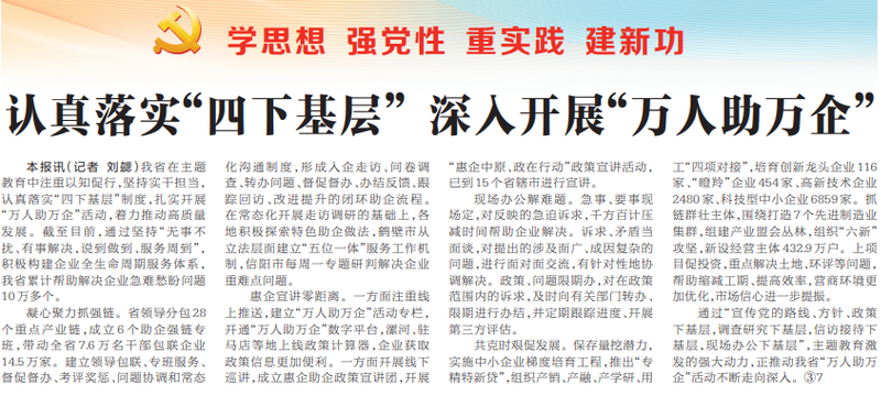 我省在主题教育中注重以知促行,坚持实干担当,认真落实“四下基层”制度,扎实开展“万人助万企”活动,着力推动高质量发展。截至目前,通过坚持“无事不扰、有事解决,说到做到、服务周到”,积极构建企业全生命周期服务体系,我省累计帮助解决企业急难愁盼问题10万多个。(今日《河南日报》2版)