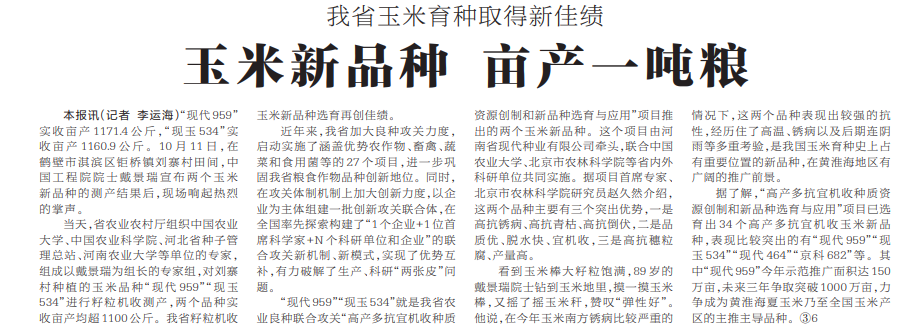 “现代959”实收亩产1171.4公斤,“现玉534”实收亩产1160.9公斤。10月11日,在鹤壁市淇滨区钜桥镇刘寨村田间,中国工程院院士戴景瑞宣布两个玉米新品种的测产结果后,现场响起热烈的掌声。(今日《河南日报》3版)
