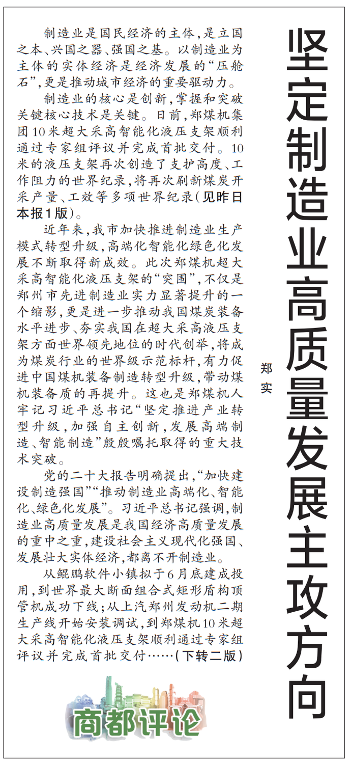制造业是国民经济的主体,是立国之本、兴国之器、强国之基。以制造业为主体的实体经济是经济发展的“压舱石”,更是推动城市经济的重要驱动力。(今日《郑州日报》1版、2版)